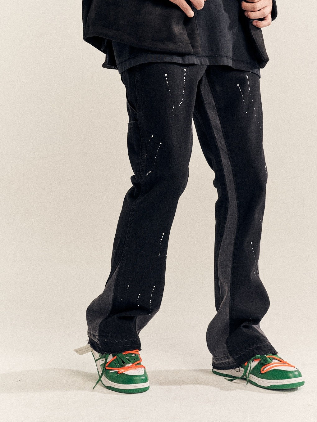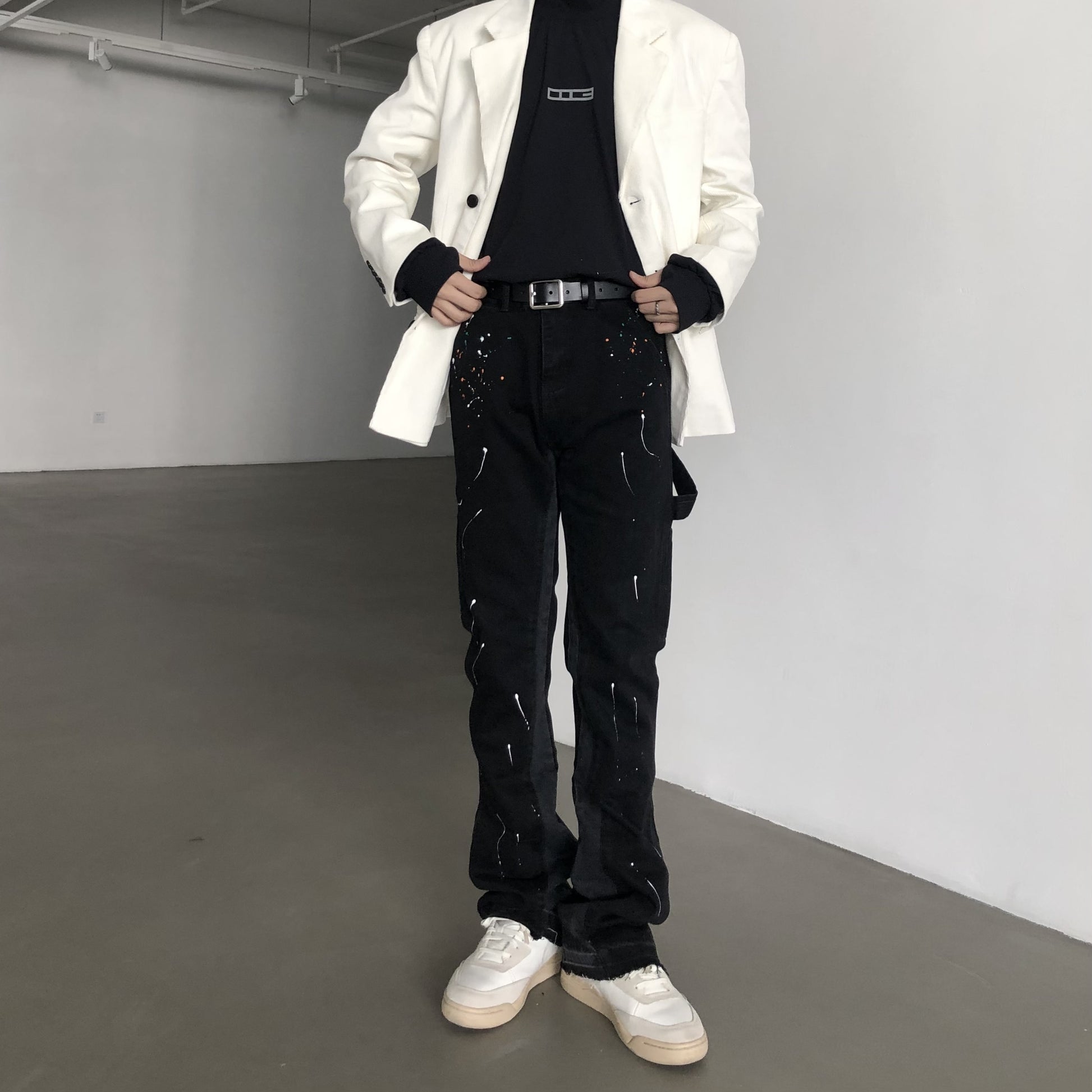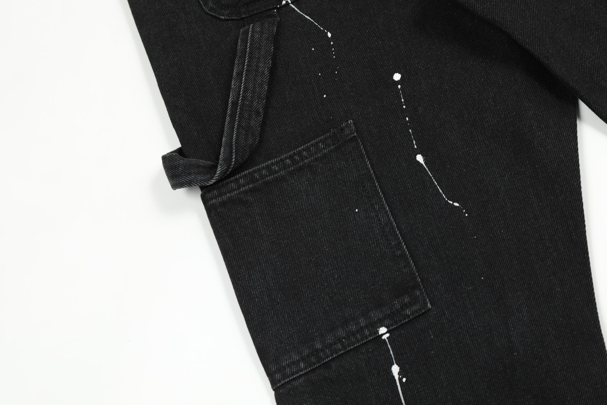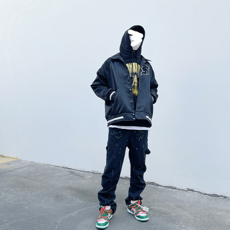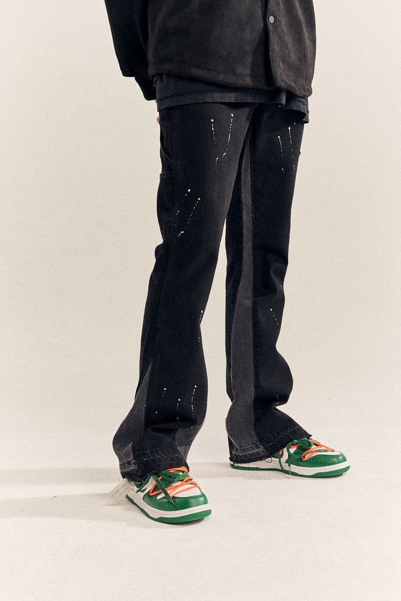 Finished stone-washed distressed pants with hand-splashed ink design at the hem, very versatile and vintage style. The splashed ink pattern on the pants is highly recommended because each graffiti splashed ink pattern is hand-drawn by art academy students, so every detail of the splashed ink size and position varies slightly. Each pair is unique with different handcraft strength resulting in different effects