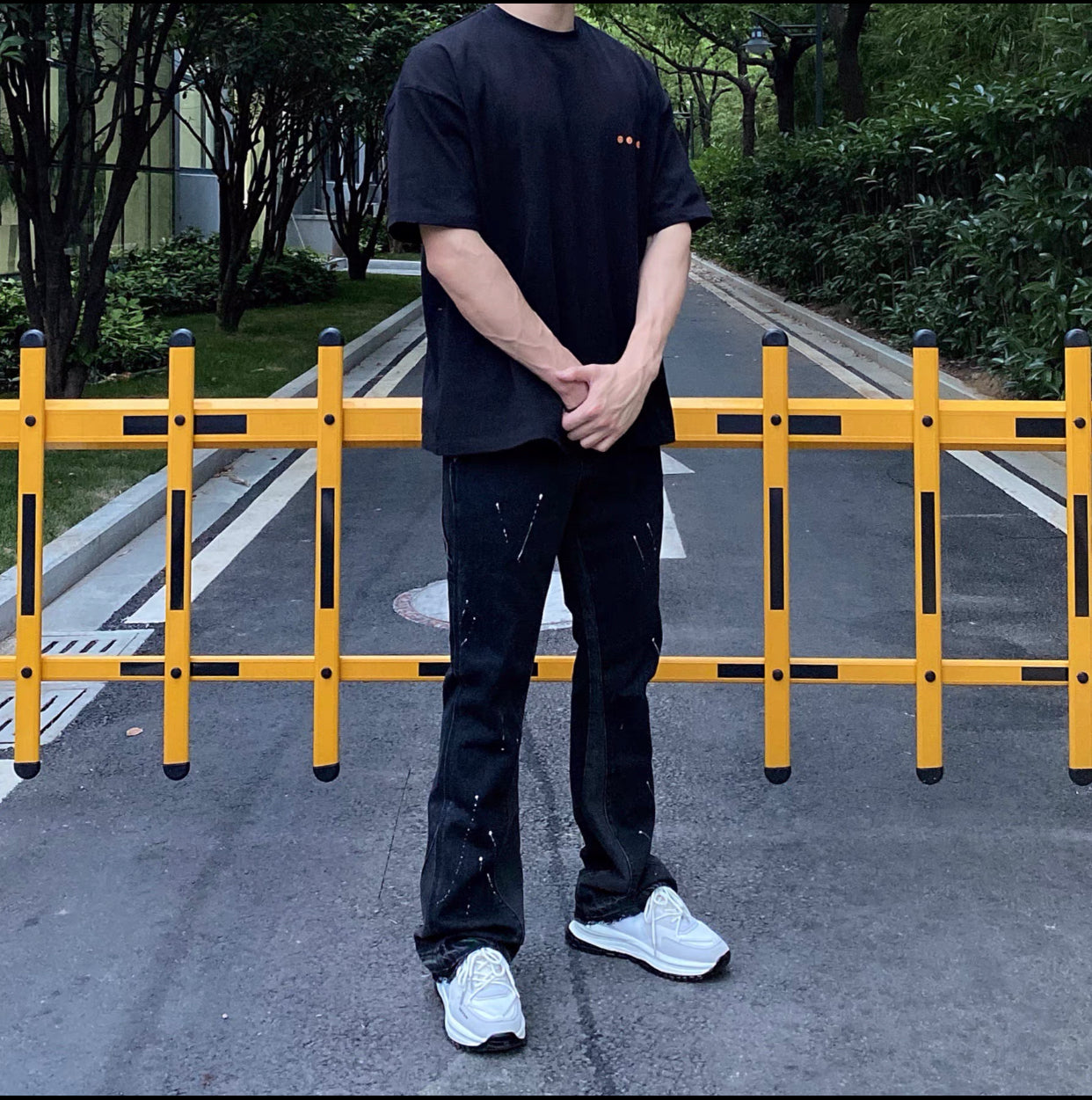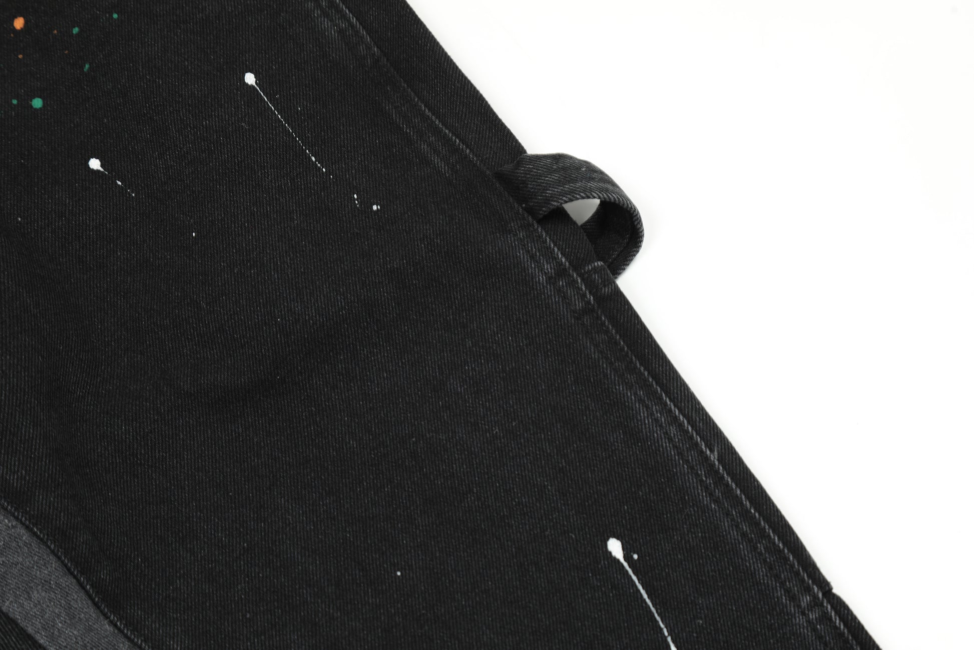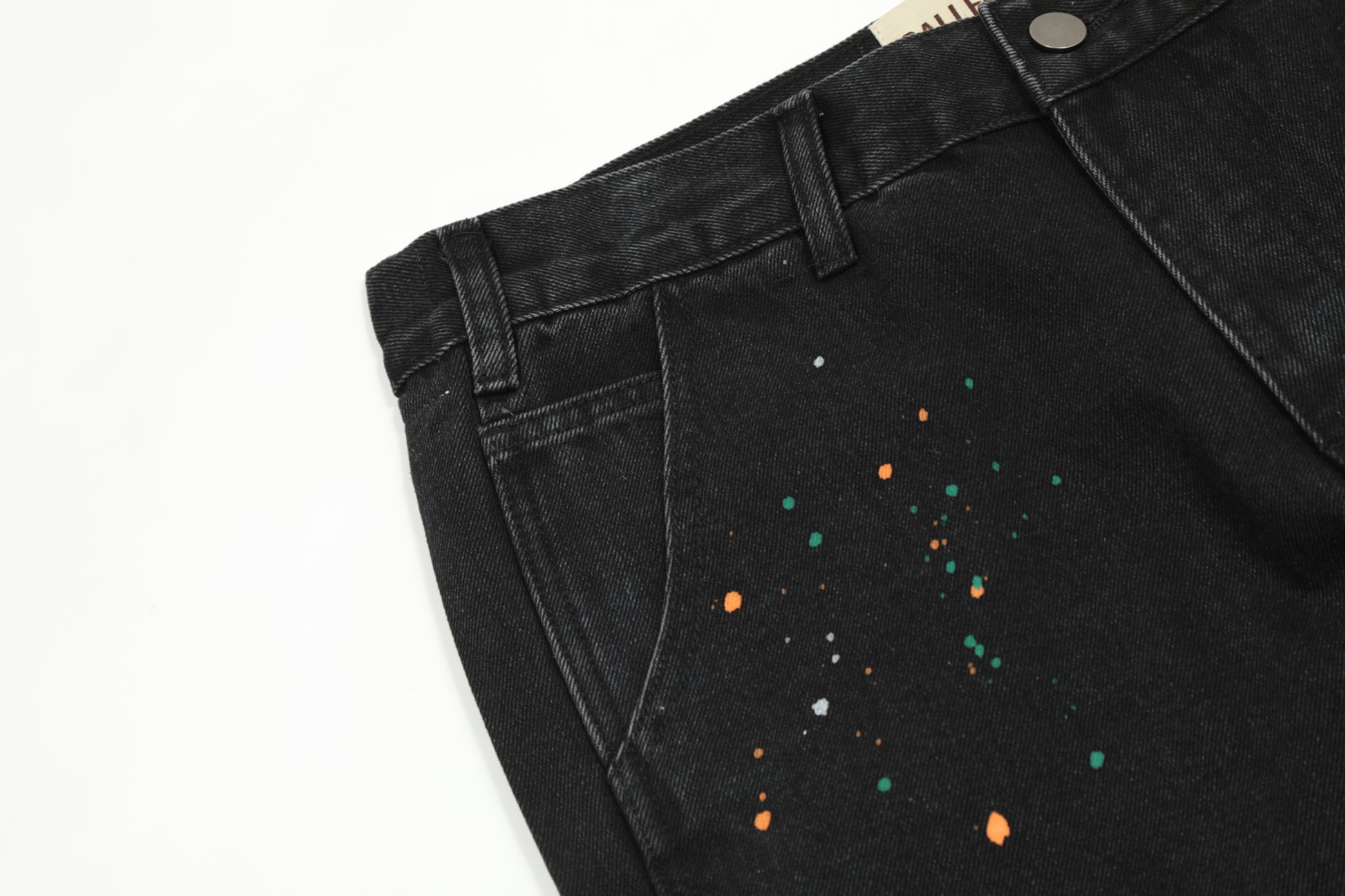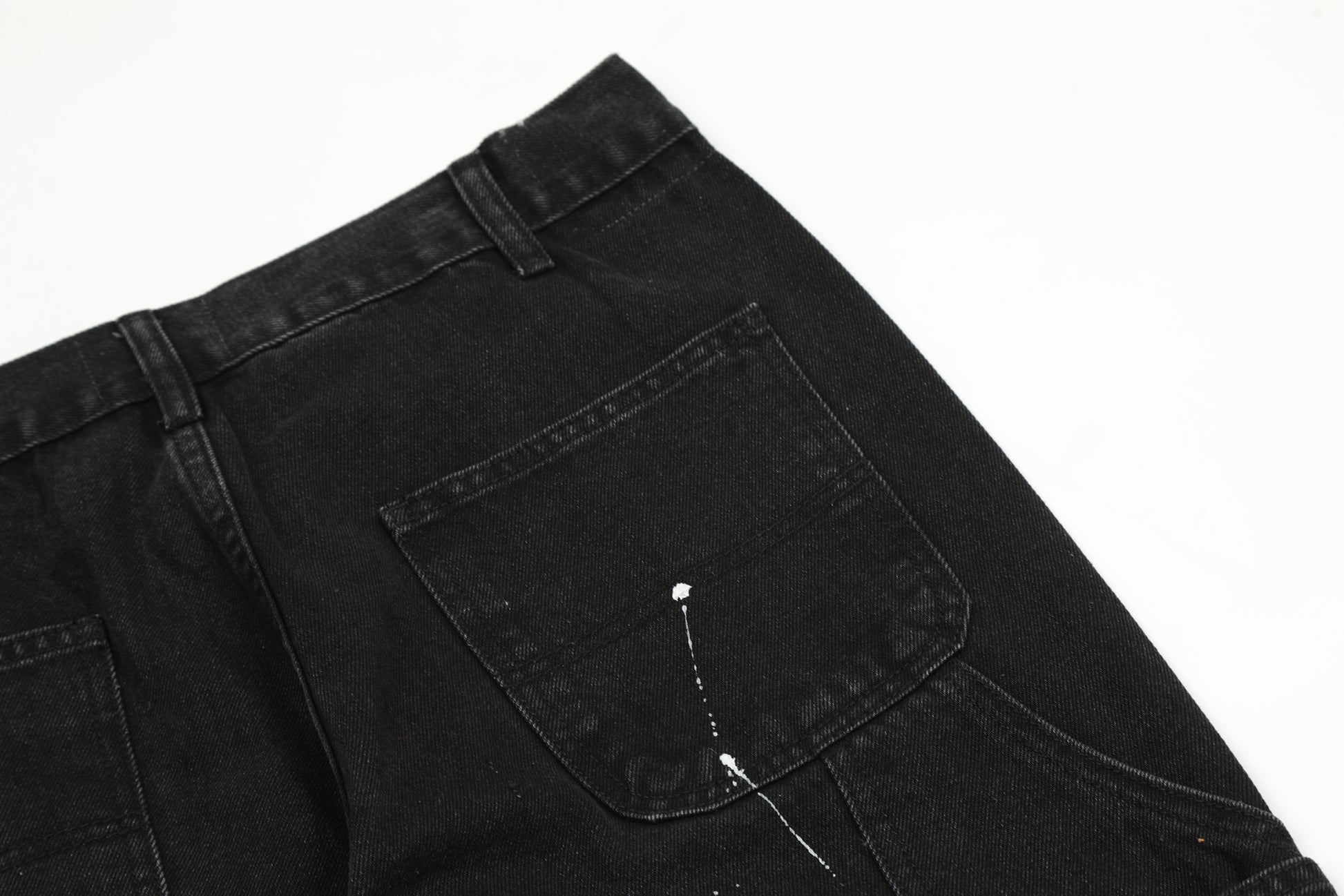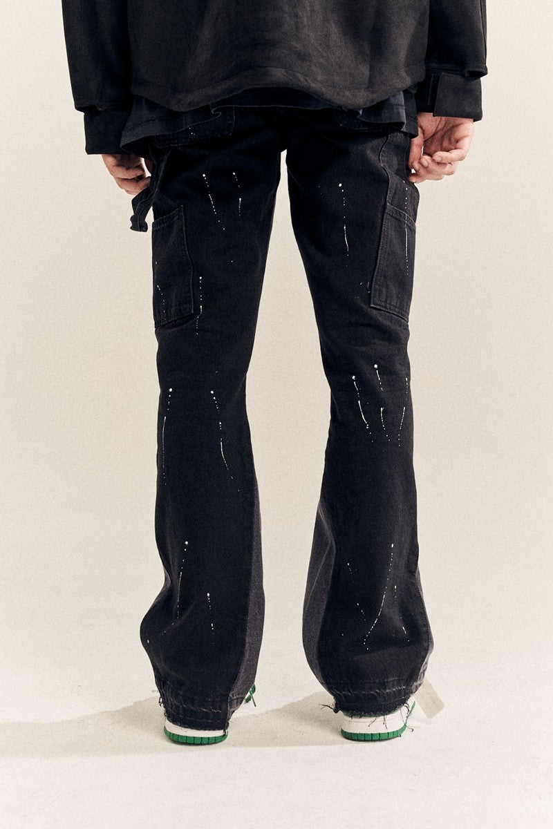 Finished stone-washed distressed pants with hand-splashed ink design at the hem, very versatile and vintage style. The splashed ink pattern on the pants is highly recommended because each graffiti splashed ink pattern is hand-drawn by art academy students, so every detail of the splashed ink size and position varies slightly. Each pair is unique with different handcraft strength resulting in different effects