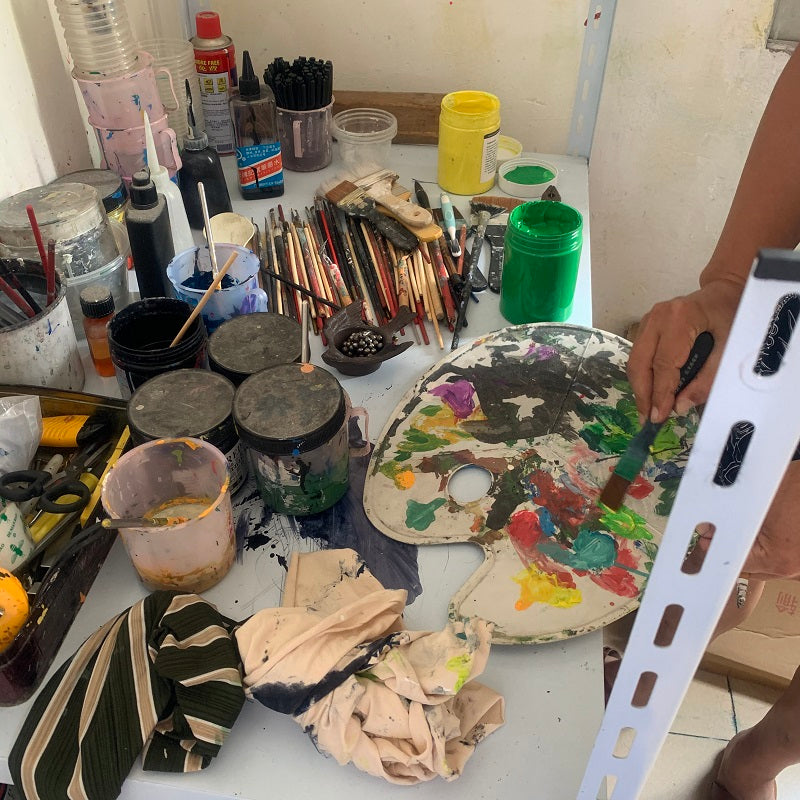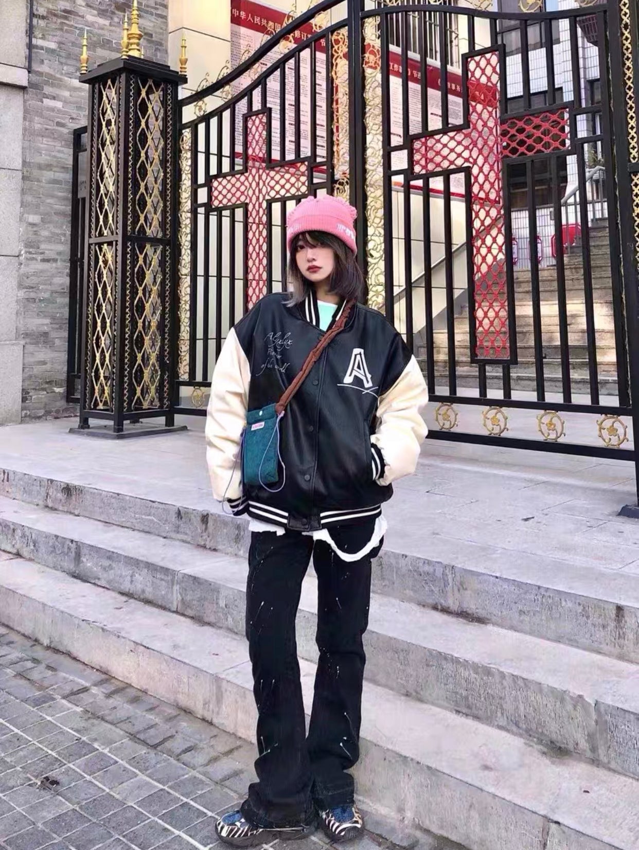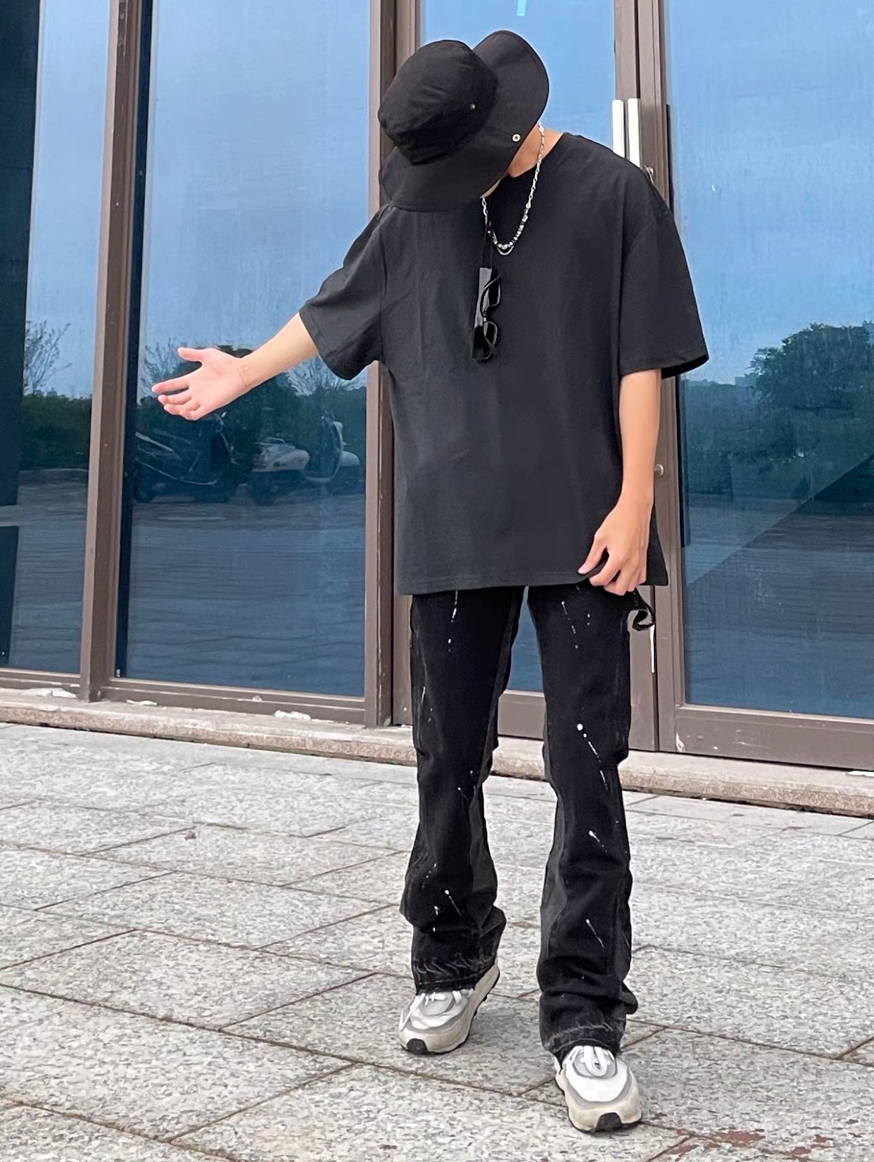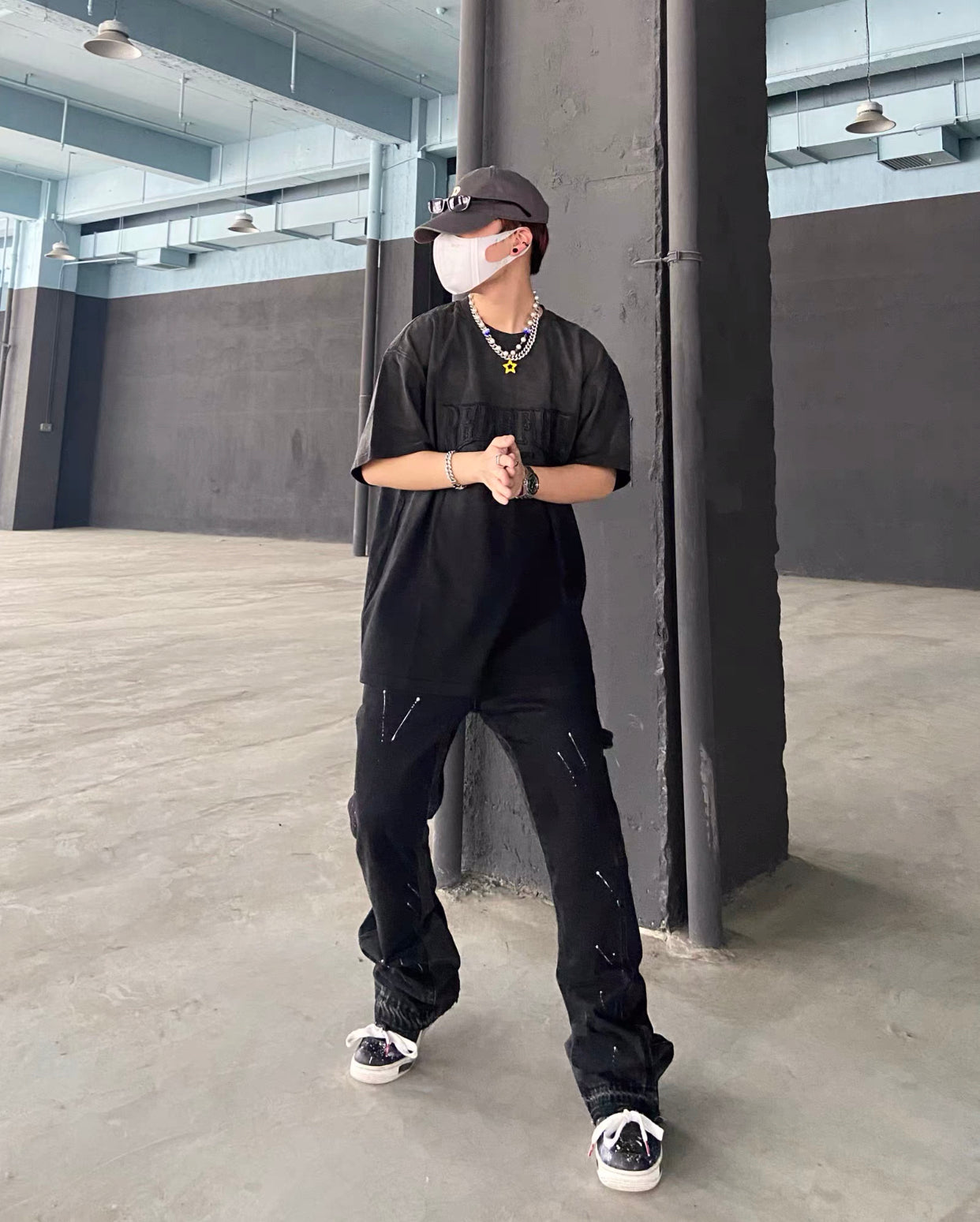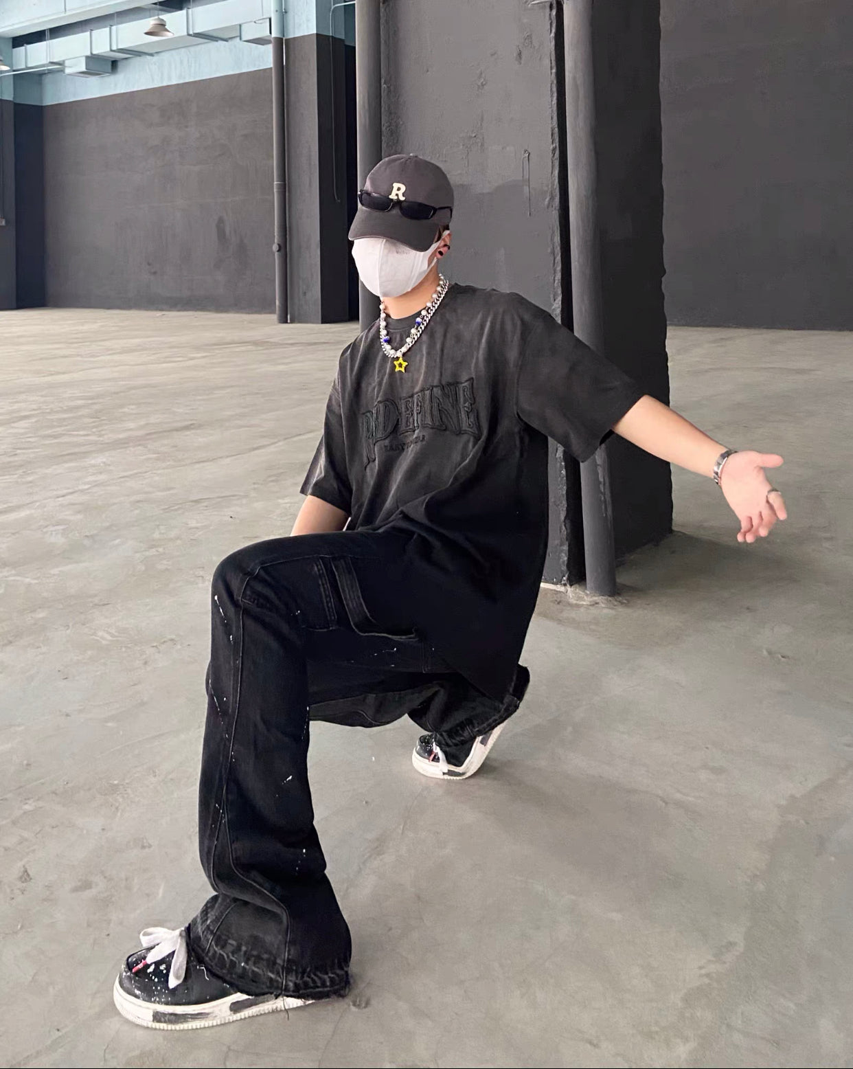 Finished stone-washed distressed pants with hand-splashed ink design at the hem, very versatile and vintage style. The splashed ink pattern on the pants is highly recommended because each graffiti splashed ink pattern is hand-drawn by art academy students, so every detail of the splashed ink size and position varies slightly. Each pair is unique with different handcraft strength resulting in different effects