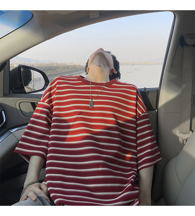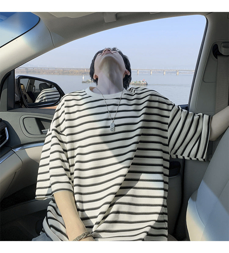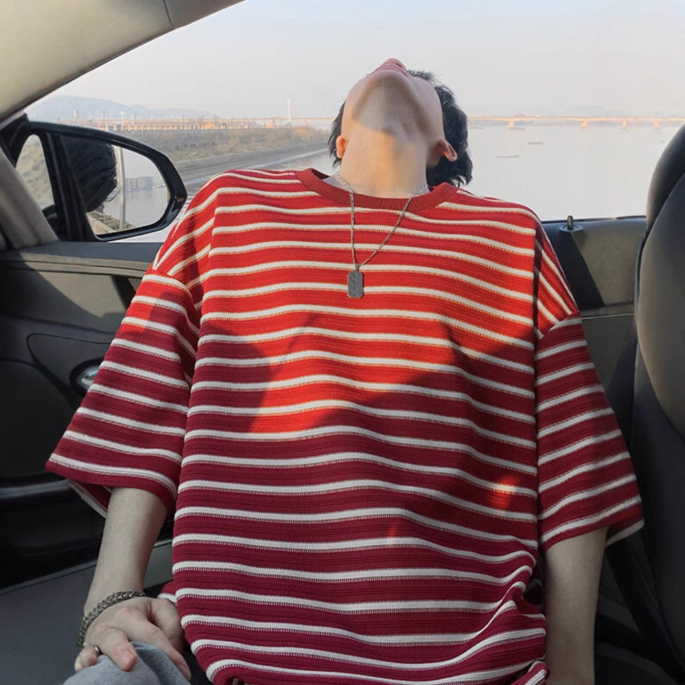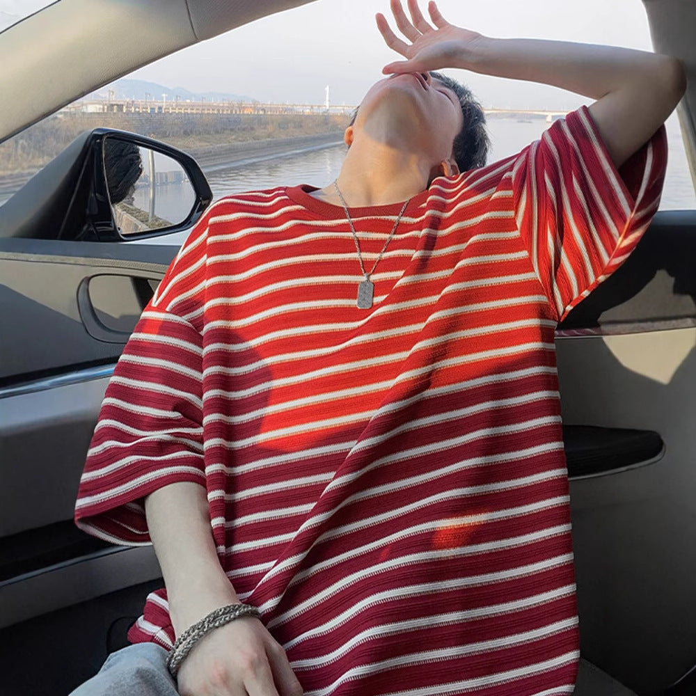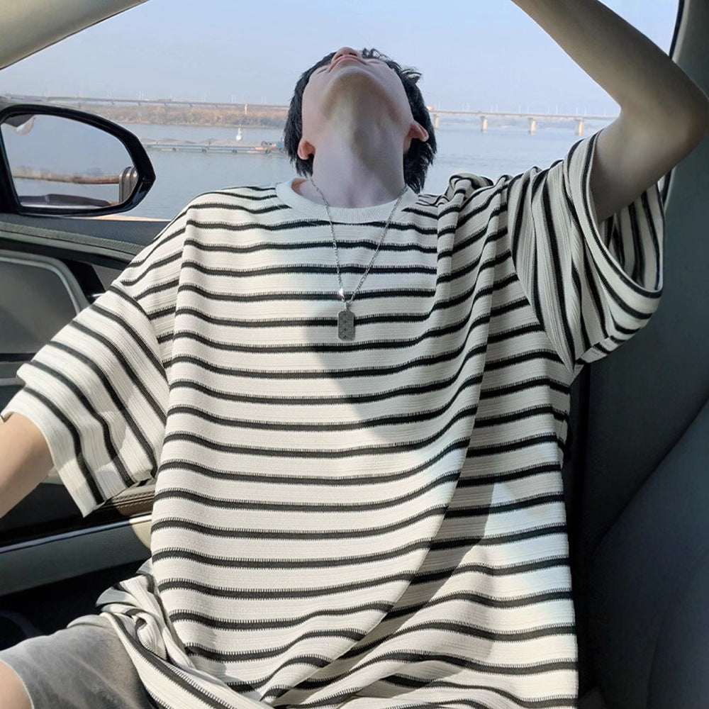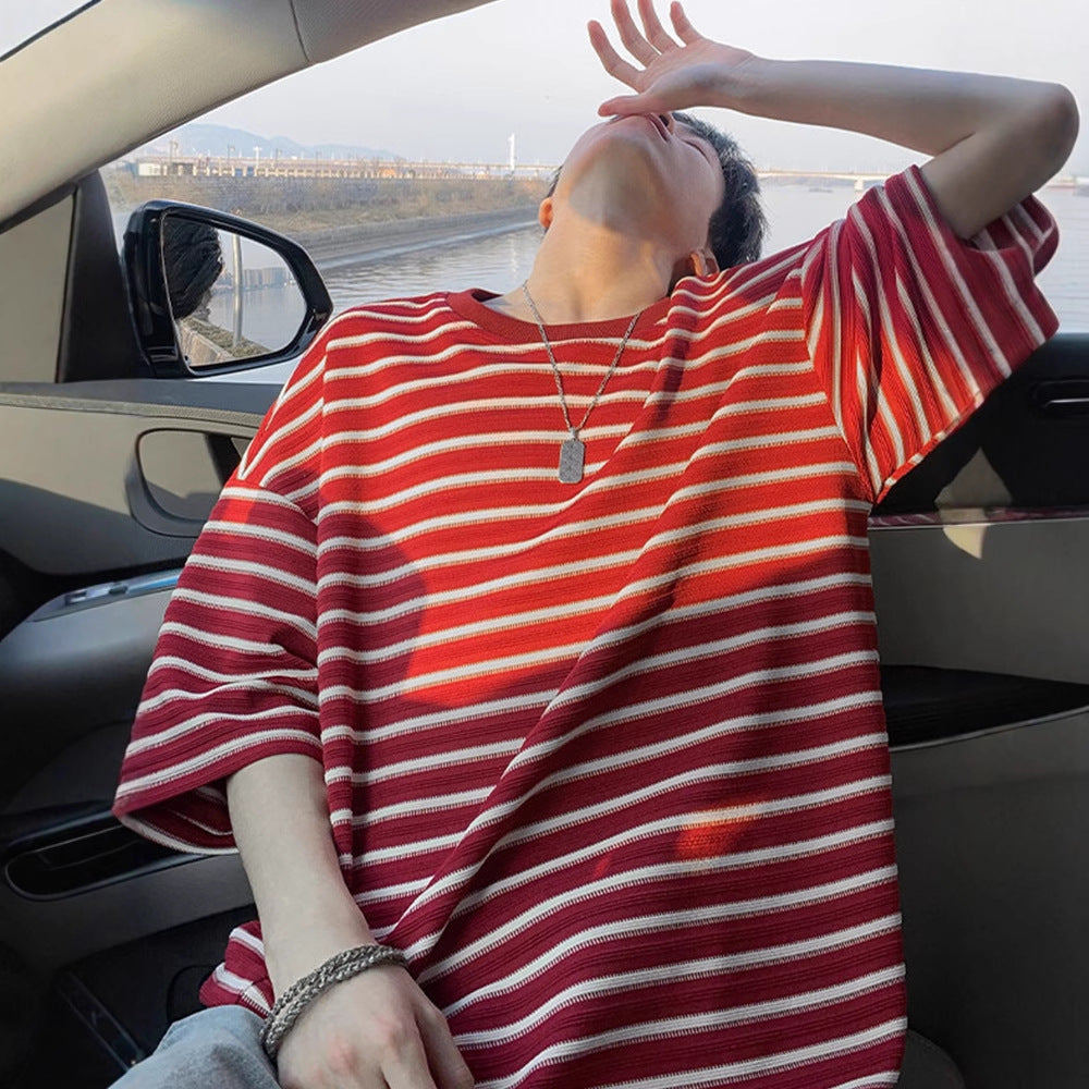 American striped short sleeve t Men's Summer Trendy Neck Loose Cotton