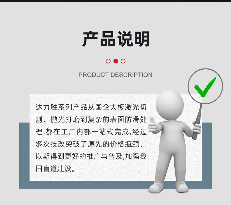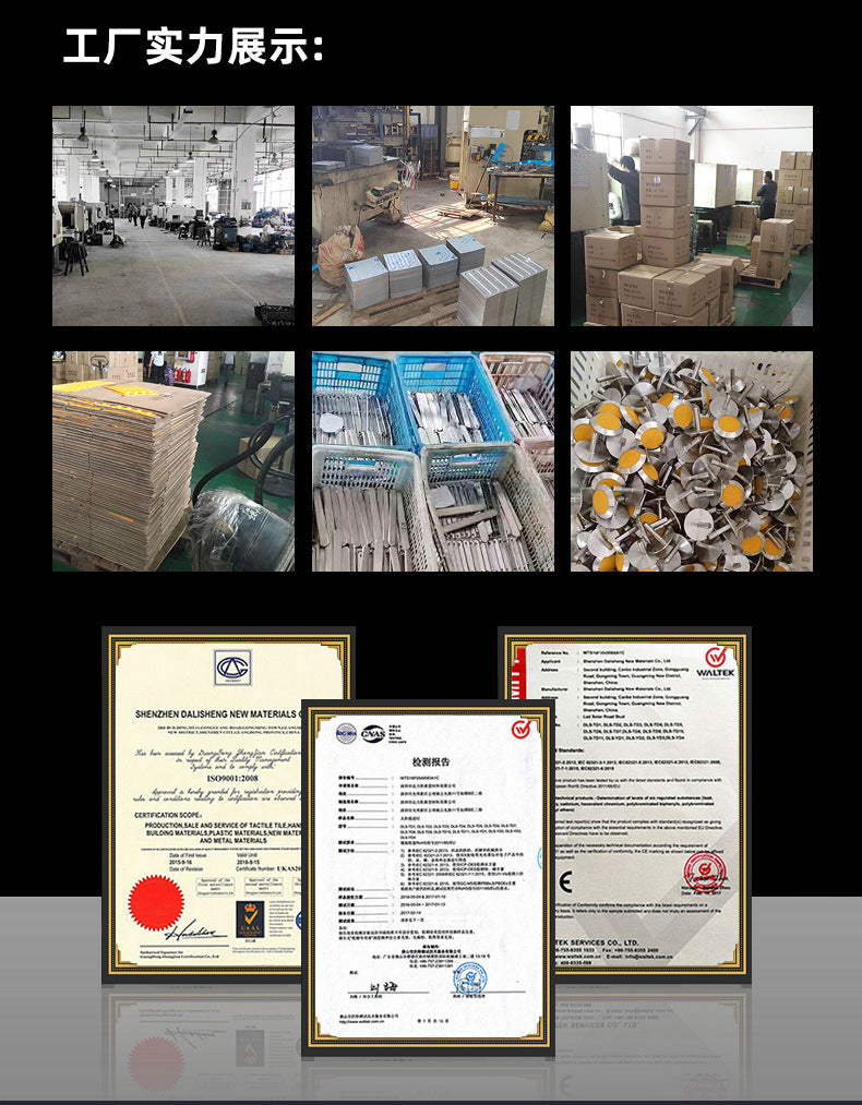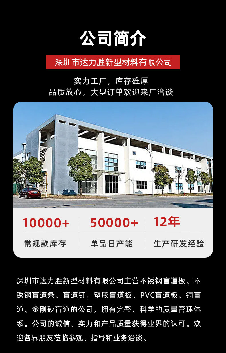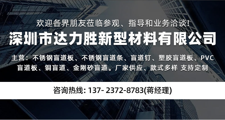Dali Sheng specializes in Braille Pathway products: Product materials include 304 stainless steel plates, 304 Braille Pathway strips, 304 Braille Pathway studs, 316 Braille Pathway strips, 316 Braille Pathway studs, PVC Braille Pathway boards, polyurethane Braille Pathway strips, TPU stainless steel various Braille Pathway products production and processing, customizable Braille Pathway products in different sizes, welcome to inquire, bulk orders offer preferential prices, factory direct sales.