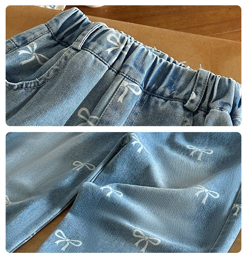 Girls' Pants Bowknot Print Jeans Wide Leg Straight2025Autumn New Fashionable and Stylish for Girls and Young Children