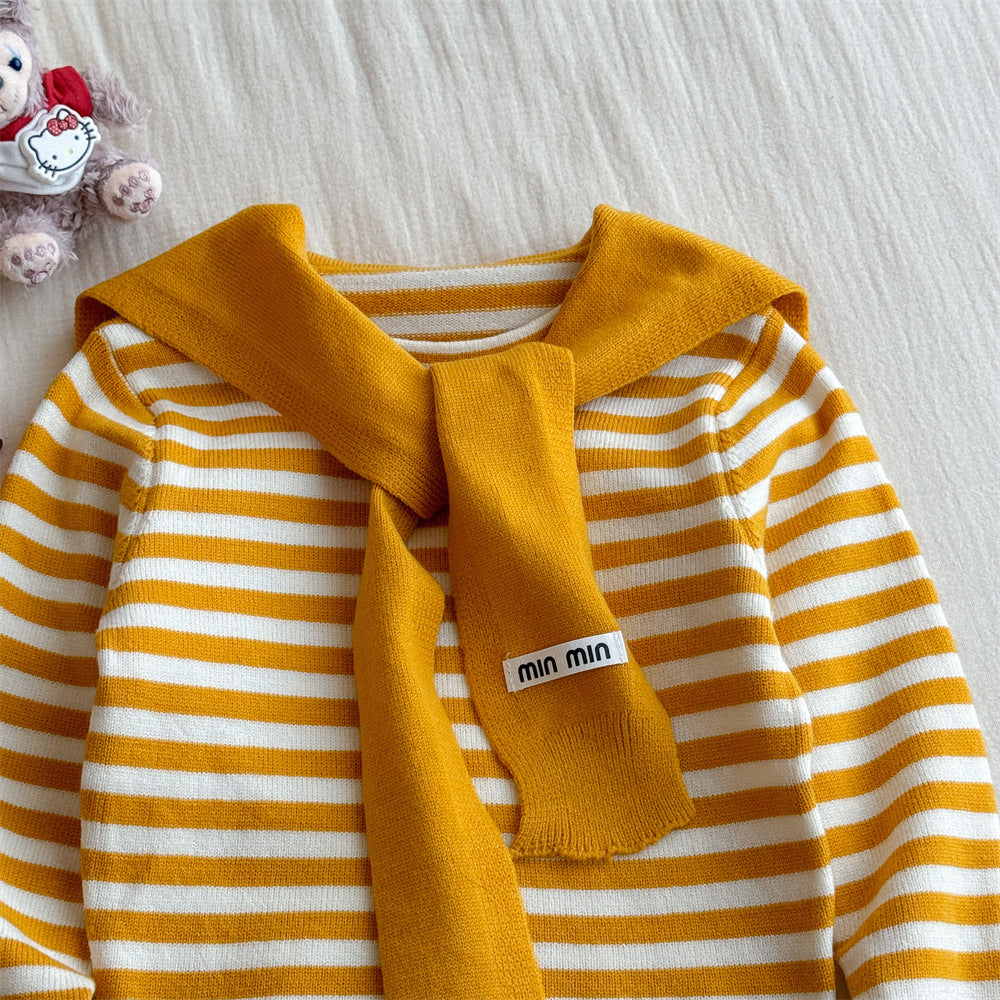 Girls' Striped Shawl Knitted Base Shirt for Outerwear, Autumn New Fashionable Color-Block Round Neck Long Sleeve T T shirt