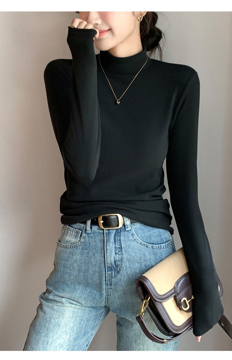 Half Turtleneck Double-Sided Thermal Base Shirt for Women, Spring and Autumn Style, Stylish Inner Wear, Solid Color, Fleece-Lined, Thickened, Warm Long-Sleeve Top