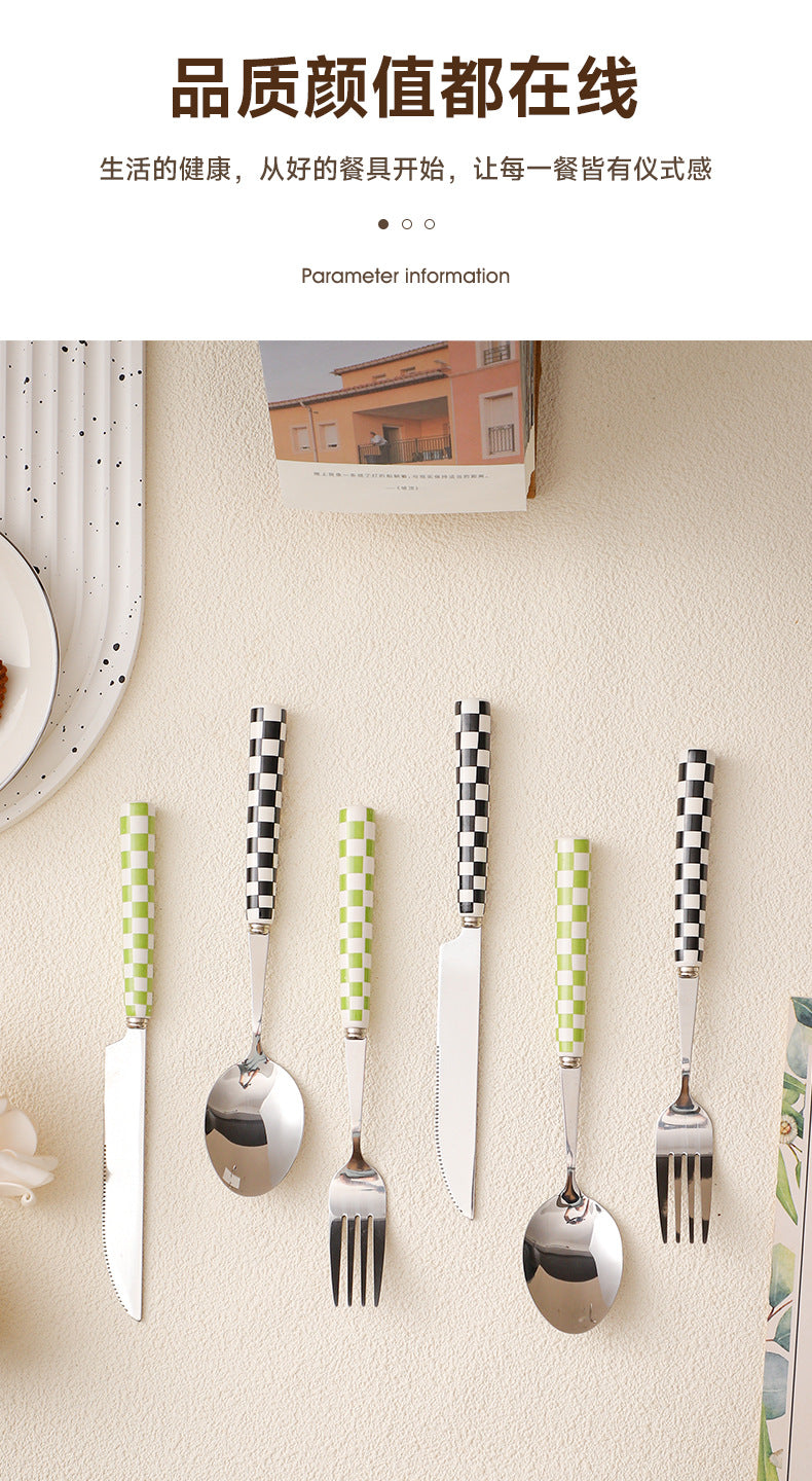 ins Checkerboard Pattern Western Steak Knife and Fork Ceramic Handle Stainless Steel Fork Spoon Dessert Cutlery Set Three-Piece Set