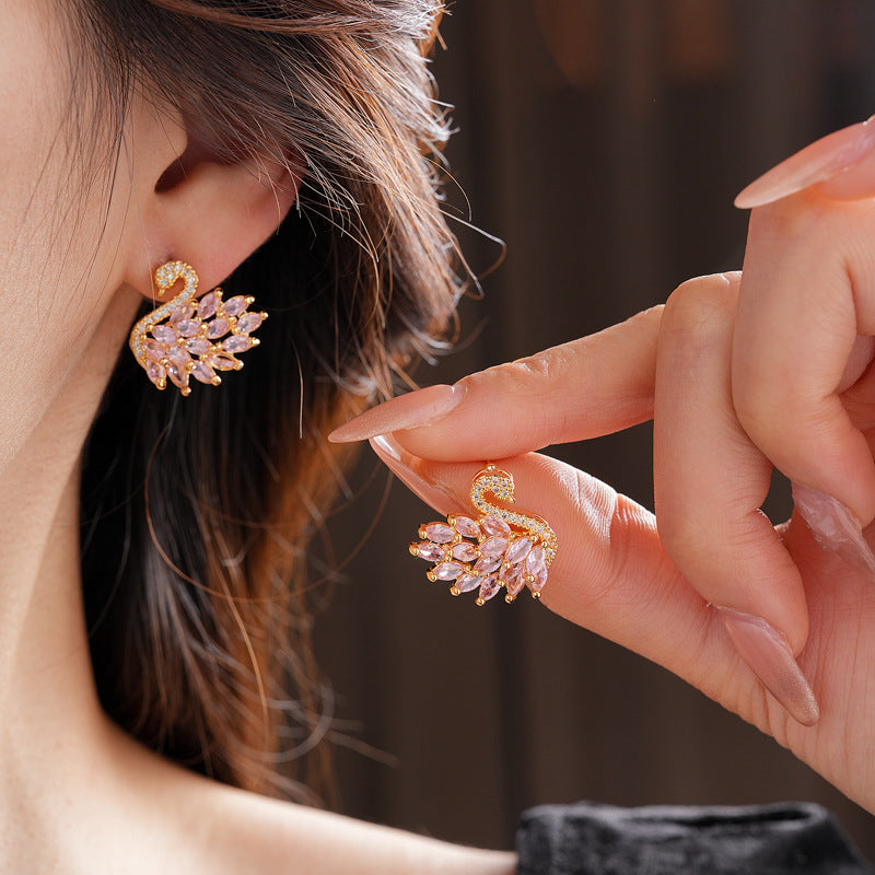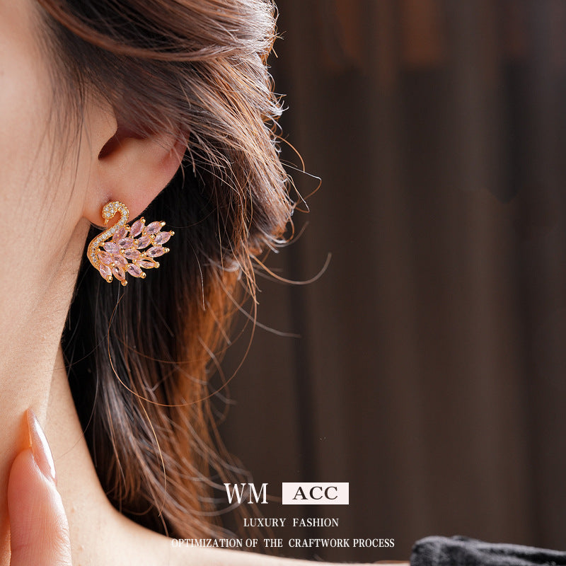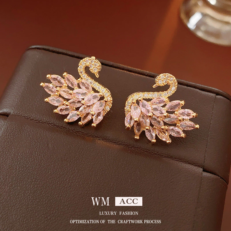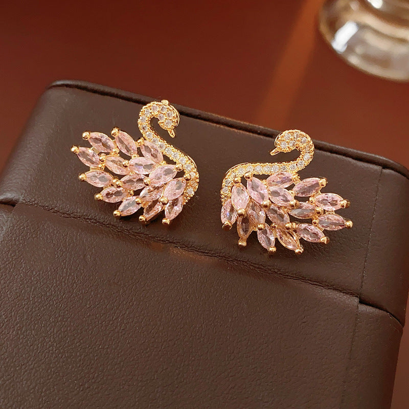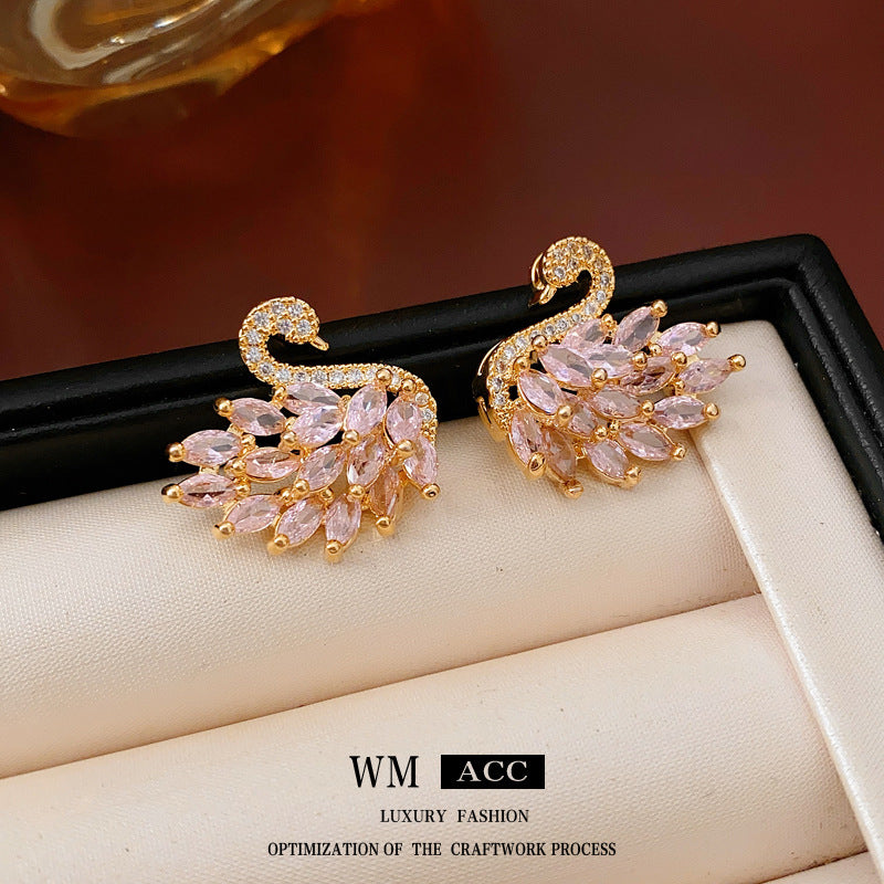 Real Gold Plated Silver Needle Zircon Swan Earrings Niche Light Luxury Exquisite ins Earrings with a high-end feel versatile for women