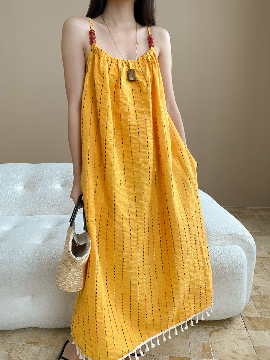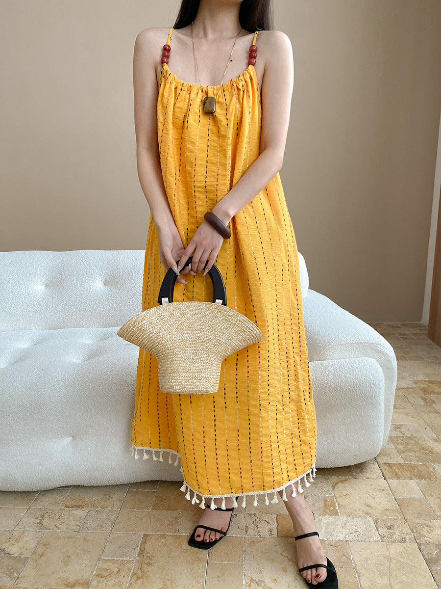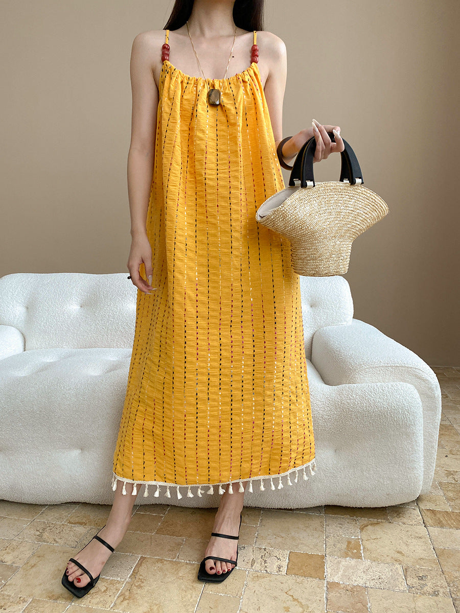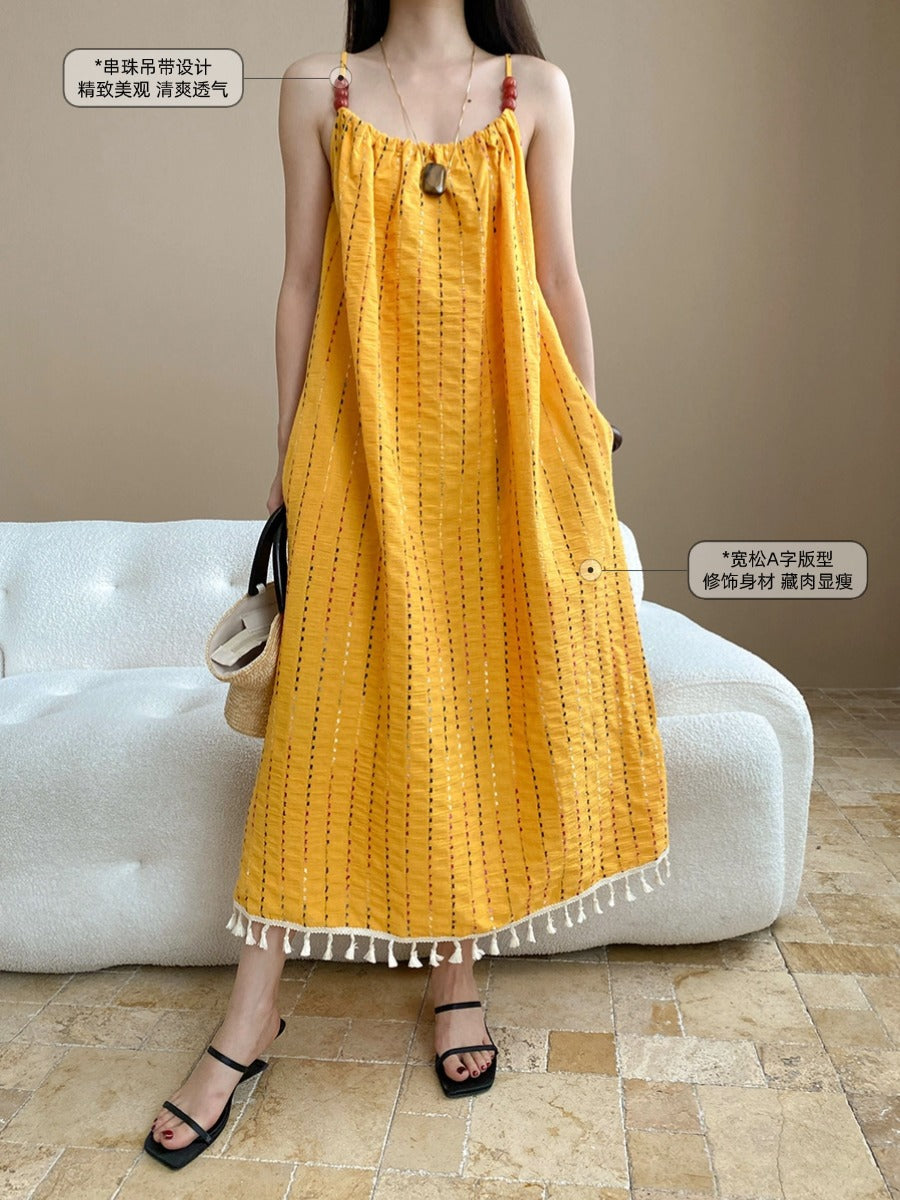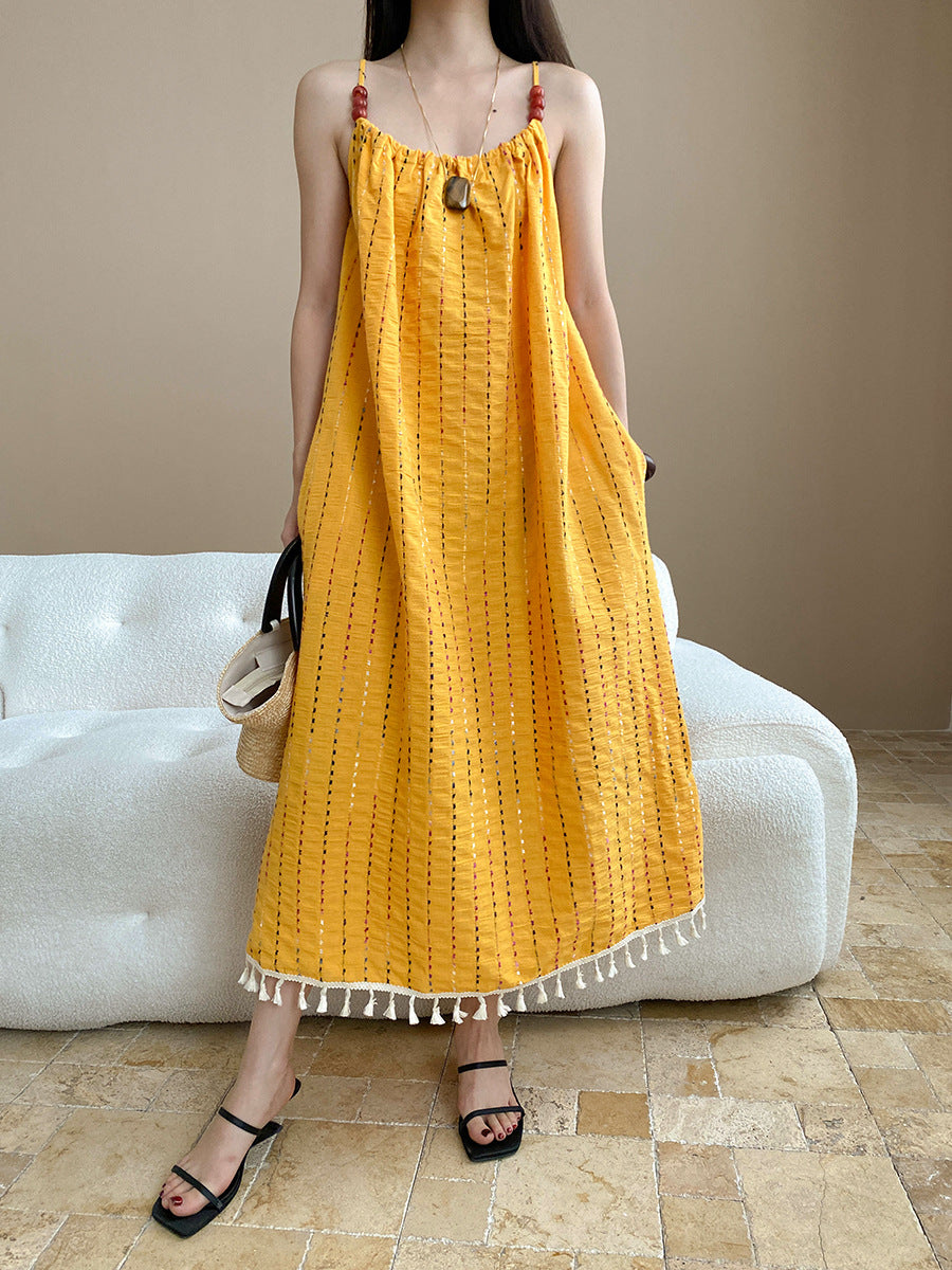Sinan At dusk and sunset Full Grid Line Beach Vacation Tassel Beaded Strap Dress SN7536