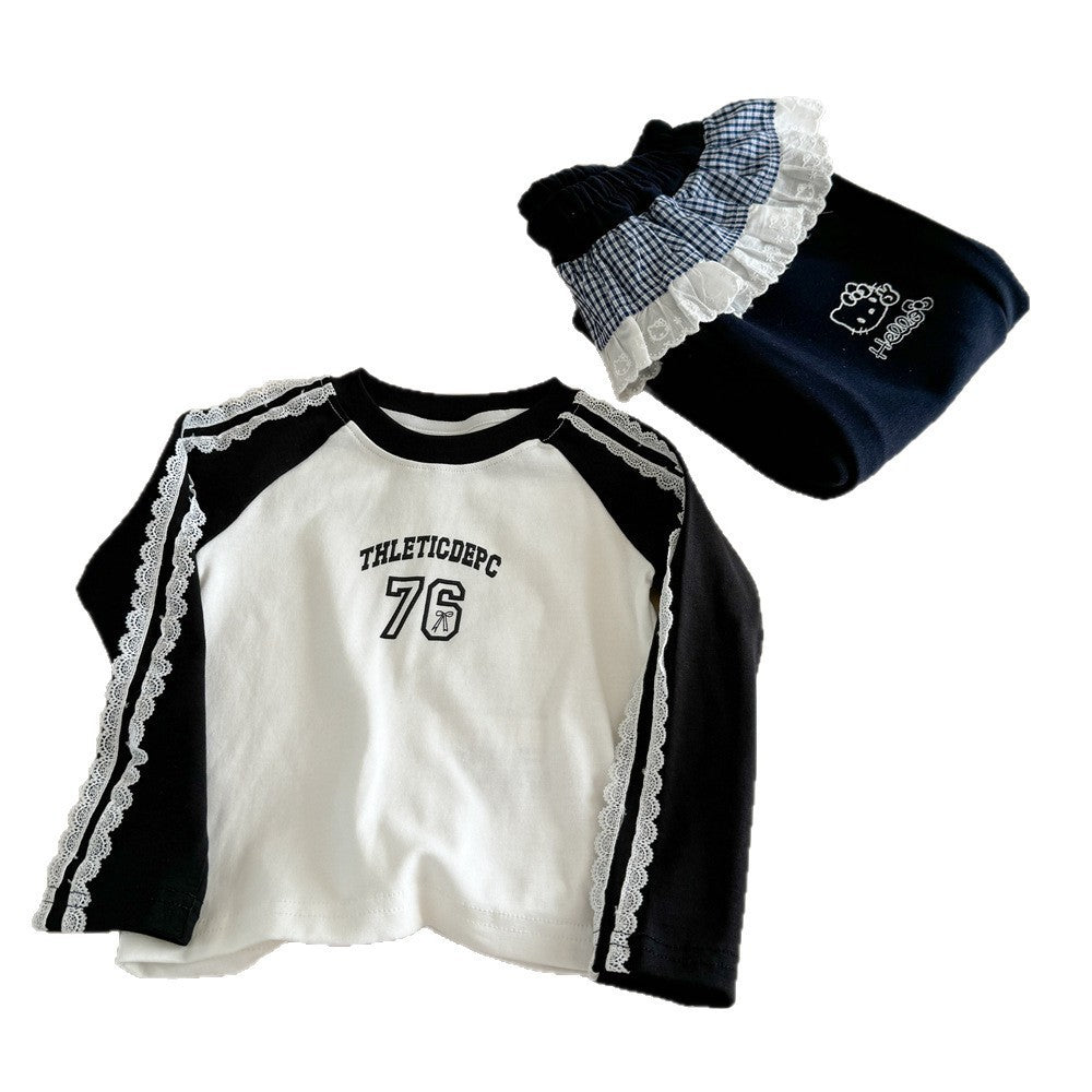 Sweet Little Girl Outfit2025Autumn Cartoon Print Long Sleeve T Trendy Fashionable Casual Cargo Pants with Curtain Design