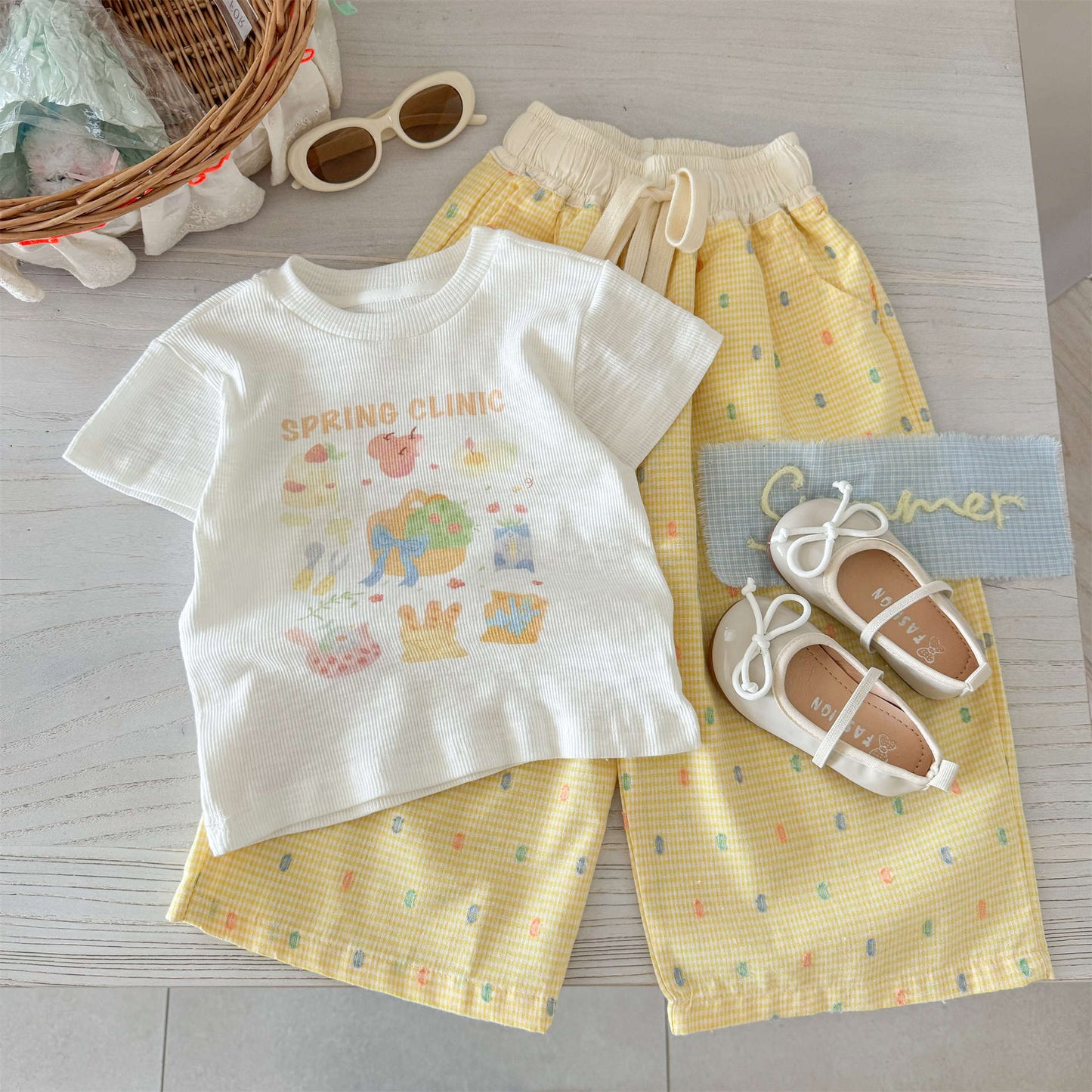 Sweet Little Girl Summer Outfit Set New Korean Version Cartoon Print Short Sleeve T T-shirt and Wide-leg Pants Two-piece Set for Baby Girls