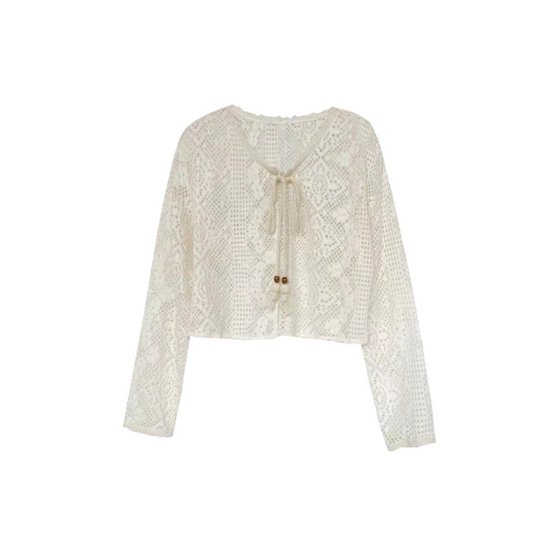 Sweet Style Irregular Denim Strap Dress Set for Women with Tassels a Long Skirt Thin Hollow Knit Cardigan